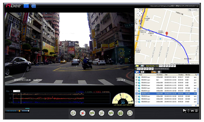 Car speed, location, driving direction and collision records are all valuable information in reconstructing the scene and retrieving the responsible party in an accident. Abee V51 keeps a complete record of GPS track, time, speed and G-Sensor information and can be attained via its exclusive computer playback software.